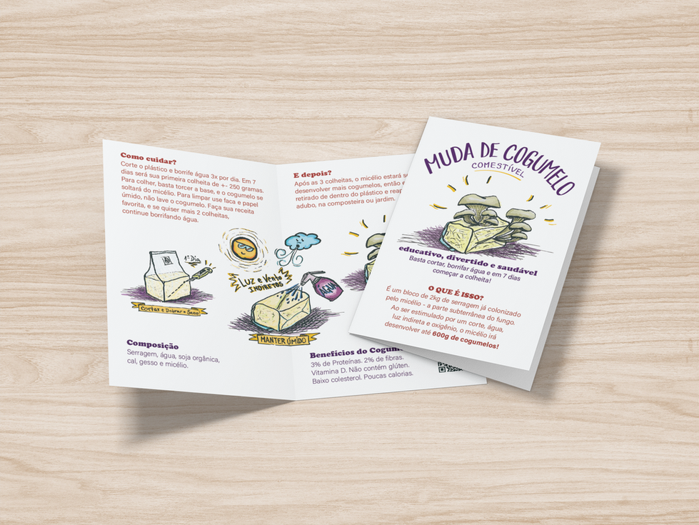 Projeto desenvolvido para a Cogumelos Clara Noite de Sol, iniciativa de agricultoras da Rede Ecovida de Agroecologia em Florianópolis, dedicada à comercialização de produtos em feiras locais. Como cofundadora da empresa, fui responsável pela criação do material gráfico, garantindo uma comunicação visual clara, simples e expressiva.
